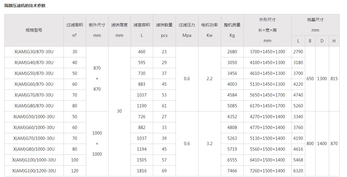 隔膜壓榨壓濾機由隔膜板和廂式濾板排列組成濾室,在輸料泵的壓力作用下將漿料輸入濾室,通過過濾介質(濾布)將漿料中的固體和液體分離,當固體形成濾餅后,向隔膜板通入高壓空氣,對濾室內的固體充分壓榨,降低濾餅含水率。對于粘性物料的過濾及含水率要求高的用戶,此機更有其獨特的特性。